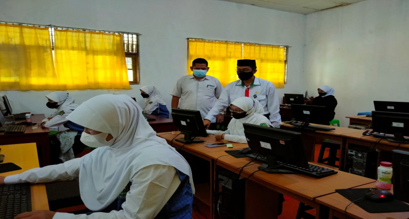 Palangka Raya (Humas) - Kepala Seksi (Kasi) Pendidikan Madrasah (Penmad) Kantor Kementerian Agama (Kankemenag) Kota Palangka Raya H. Supiani HK didampingi Staf Penmad Suryanto dan Anang Jarnawi melakukan monitoring hari kedua simulasi Asesmen Nasional Berbasis Komputer (UNBK) tahap I, Selasa (31/8/2021) di ruang laboratorium Komputer.